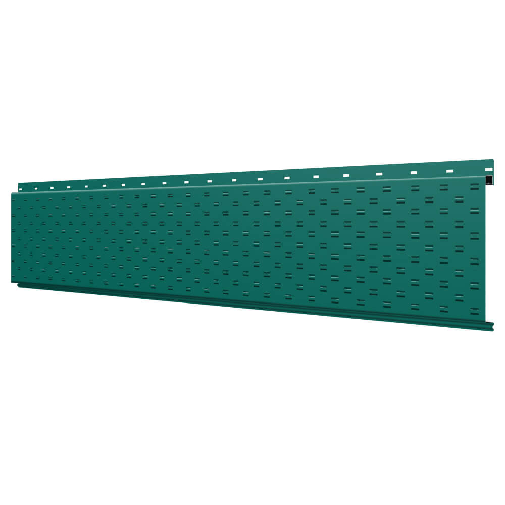 Линеарная потолочно-стеновая панель с ПЕРФОРАЦИЕЙ для вентиляции цвет RAL6026 Опал применяется в качестве софитов для подшивы крыши, наружной и внутренней отделки потолков, стен, фронтонов фасада дома в Ярославле.