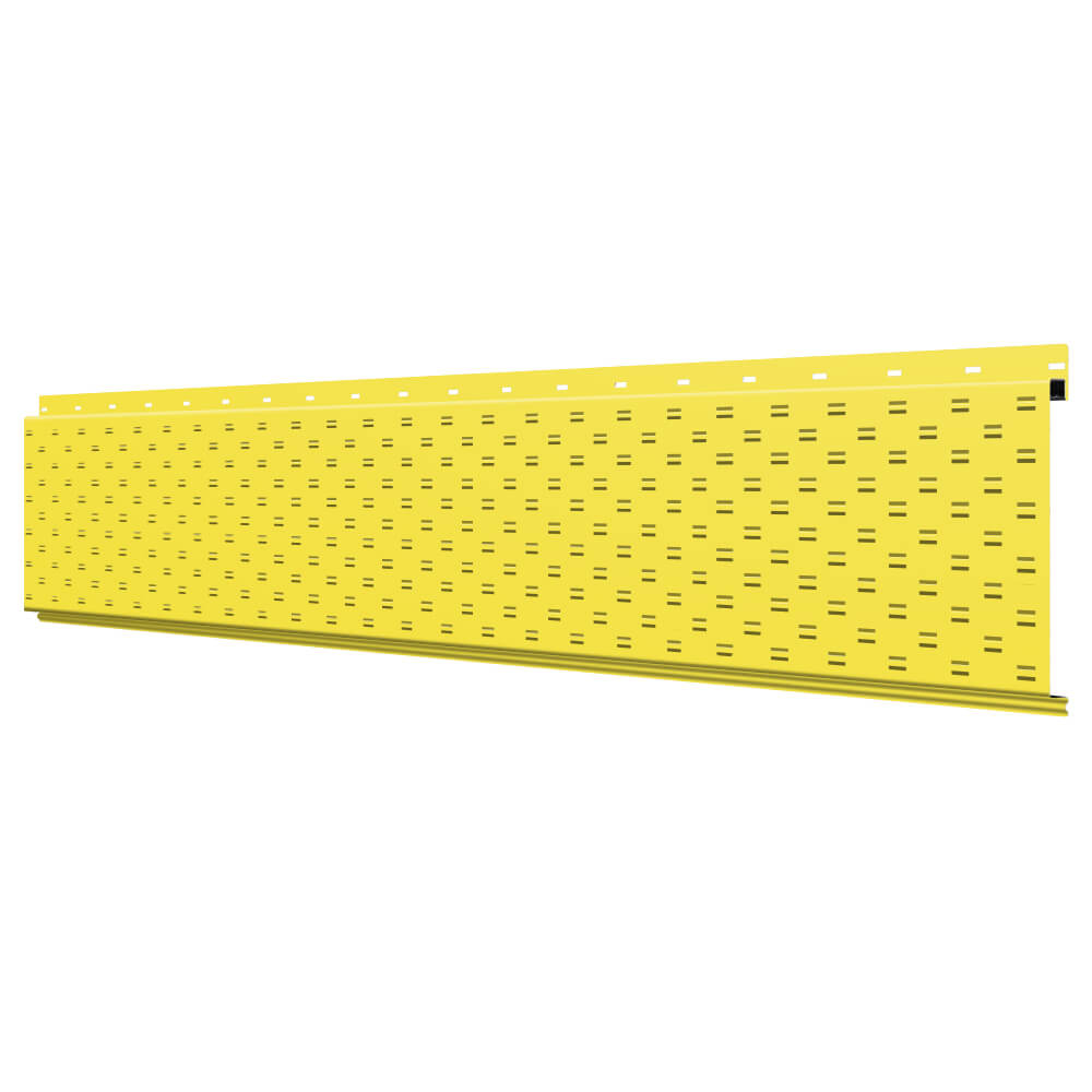 Линеарная потолочно-стеновая панель с ПЕРФОРАЦИЕЙ для вентиляции цвет RAL1018 Желтый применяется в качестве софитов для подшивы крыши, наружной и внутренней отделки потолков, стен, фронтонов фасада дома в Ярославле.