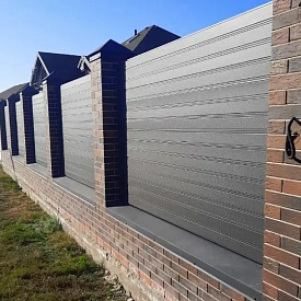 Секция забора ранчо из металлопланкена собирается по аналогии с заборами жалюзи: к столбам крепятся боковые П-образные направляющие, ламели планкен используются для заполнения секции. Рекомендуемая длина секции – не более трех метров.