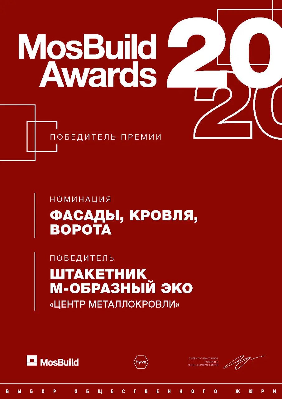 Диплом победителя премии MosBuild Awards 2020 продукт "Штакетник Эко М-образный"